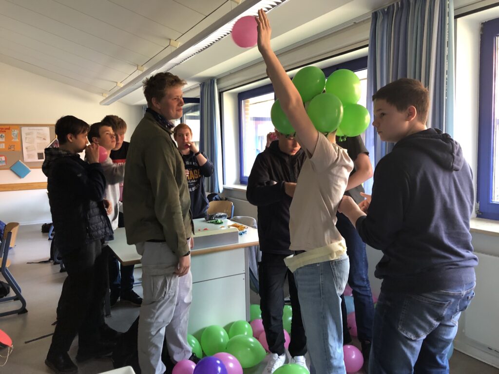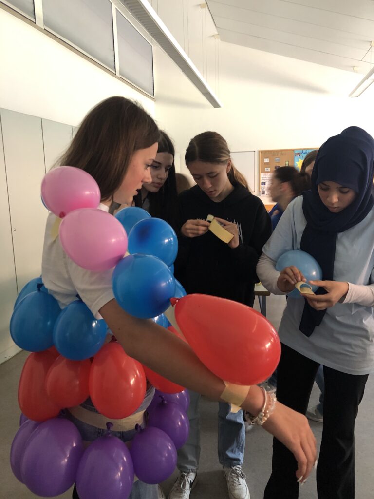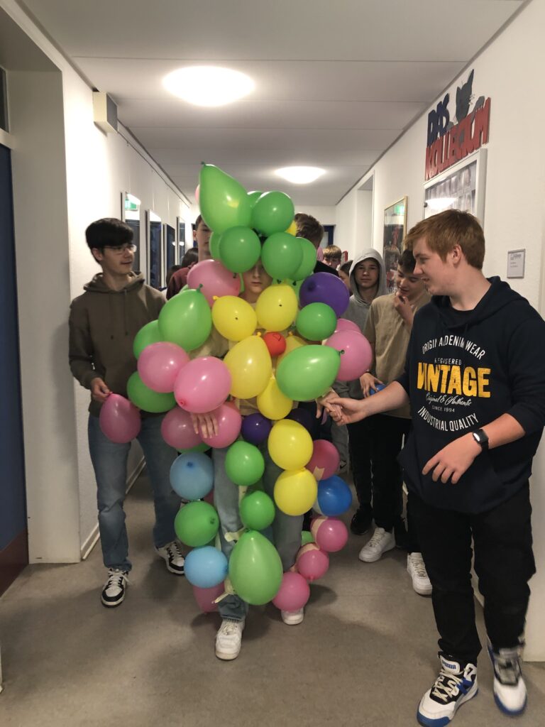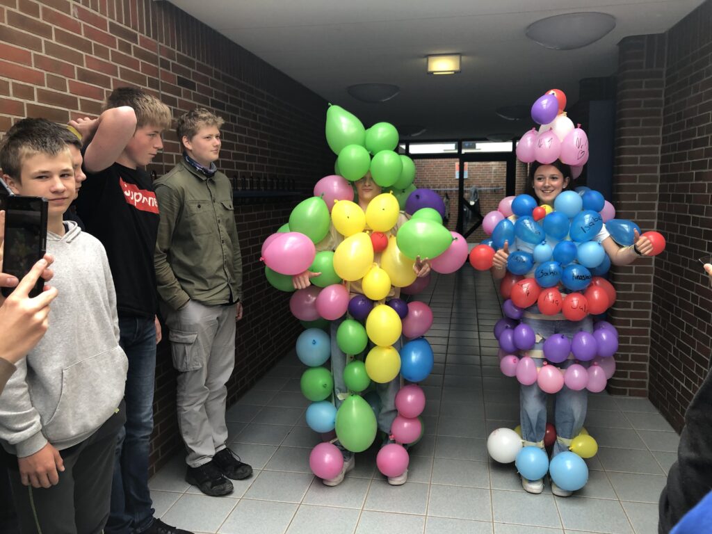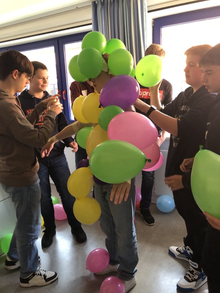 Unsere Fotos zeigen das Ergebnis einer Teamarbeit, in der zwei Gruppen eine Mitschülerin und einen Mitschüler zu einem Ballonmonster „umbauen“. Dabei haben sie in einer bestimmten Zeit ein System entwickeln müssen, in dem einige das Monster bauen, andere Ballons aufpusten, einige die Knoten fertigen und wieder andere die kreative Gestaltung übernehmen und alle Hand in Hand arbeiten.